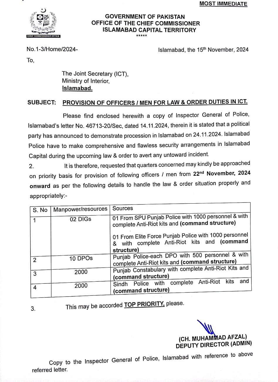 پنجاب پولیس سے دو ڈی آئی جیز، اور دس ڈی پی اوز اسلام آباد میں ڈیوٹی کرینگے