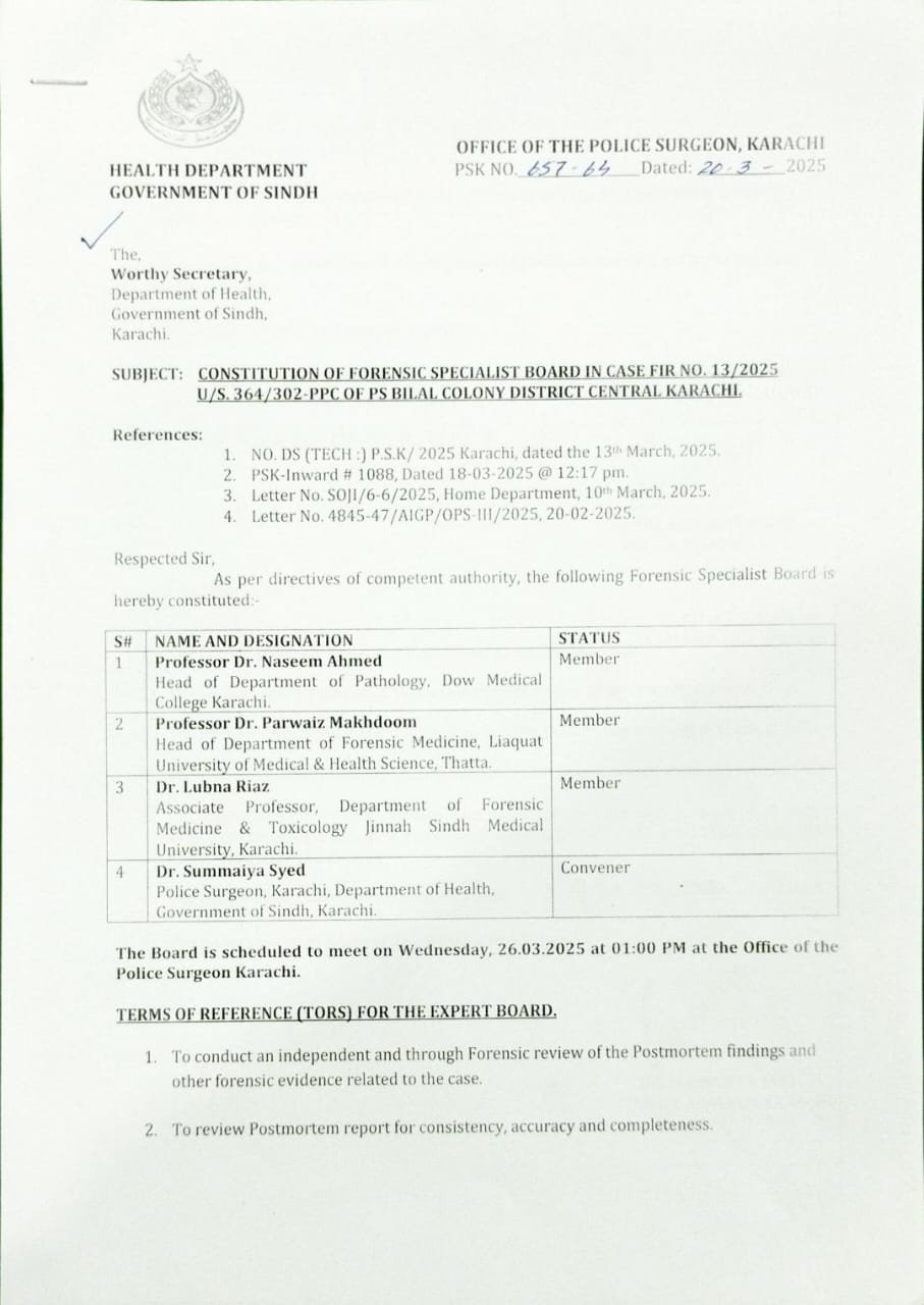 ماہر ڈاکٹرز اور فارنزک ایکسپرٹ پر مشتمل بورڈ پوسٹ مارٹم رپورٹ سمیت دیگر شواہد کا جائزہ لے گا