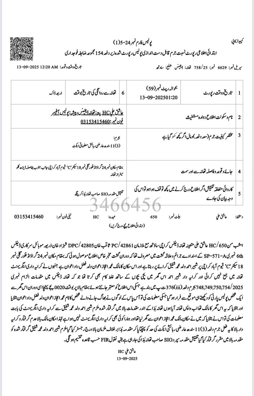 مقدمہ سرکار مدعیت میں مکان مالک اعجاز اعوان اور ملزم شبیر احمد تنولی کے خلاف درج کیا گیا ہے