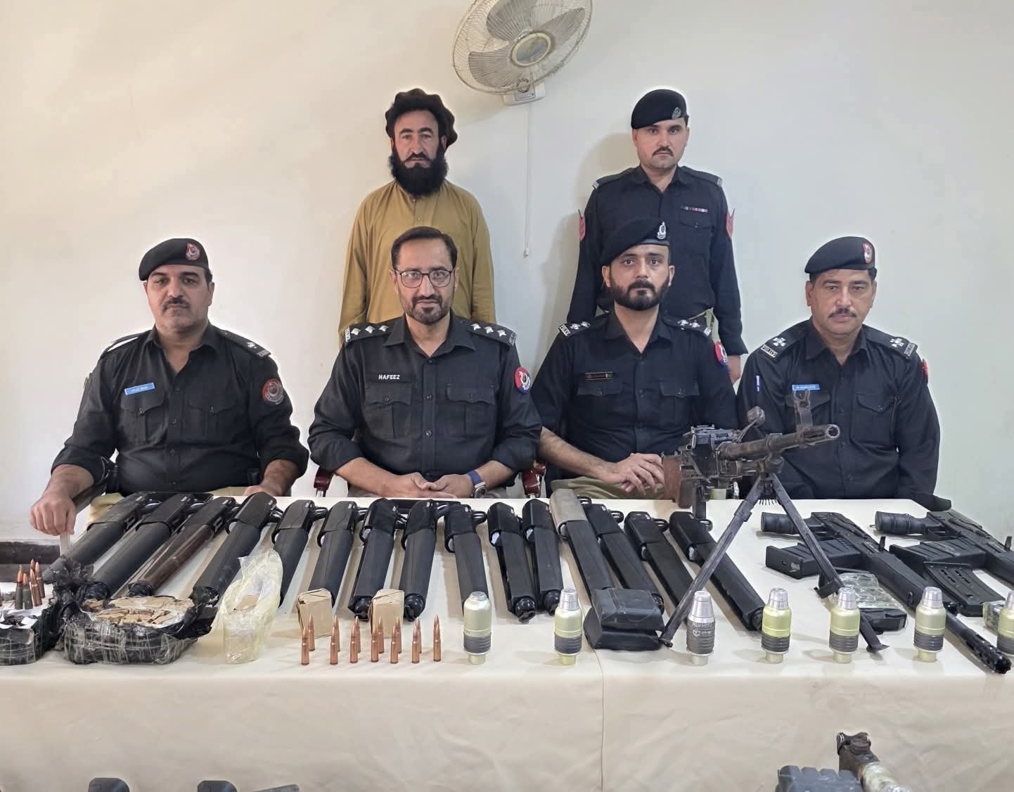 گرفتار سمگلر کی قبضے سے 02 عدد ہیوئ مشین گن، 08 عدد گرنئڈ ،29 عدد رپیٹر اور درجنوں کارتوس برآمد۔ پکڑا گیا اسلحہ کرم سے پشاور سمگل کیا جارہا تھا